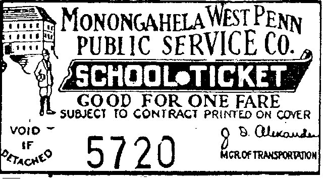 Besides walking for some students who lived near VICTORY, the earliest transportation was by street car. The school buses came later. Those living from Spelter/Ziesing area could ride the street car as did some living at Erie, McIntyre, Reynolds Siding, Dawson Mine, Gore and Perry Mine. They would disembark at Limestone Junction and walk up to the school. Students from as far as Reynoldsville including Chiefton, O'Neil, Wilsonburg and Liberty Addition would disembark at Limestone where Rt. 19 crossed the tracks near the former Quaker State Refinery Building. Glenwood Hill students walked to VICTORY. Those living in Despard/Summit Park could ride the street car to Clarksburg, obtain a transfer and ride the Adamston car. The Despard car went to Stealey. Students in the North View area, for those who didn't walk, could ride the North View Car and transfer to either the Fairmont or Wolf Summit car where it's tracks connected with the Fairmont/Wolf Summit line. With a transfer ticket they could ride and disembark at the Adamston stop or ride on down to Limestone Junction. The above photo is one of the North View cars at the end of the line at the former Rolland Glass Factory. All fares, within a four mile radius of Clarksburg, were only seven cents. In later years, 1923, the Monongahela West Penn Public Service Company issued school tickets at a reduced price. See sample school ticket below.